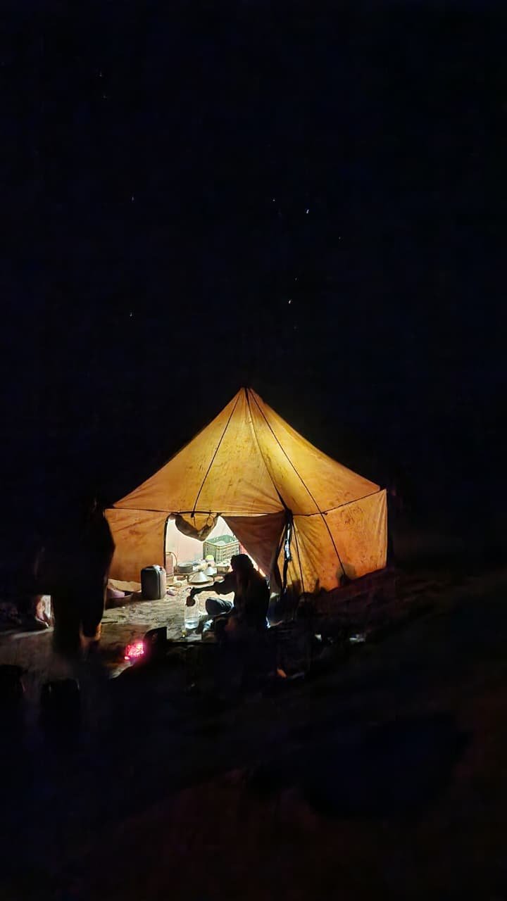 The trek continues through landscapes rich with desert plants. Around midday, the group reaches Telhatine for lunch and rest near a well. In the afternoon, the journey resumes toward Kraat Jemal, where the evening is spent in camp beneath a starlit sky.