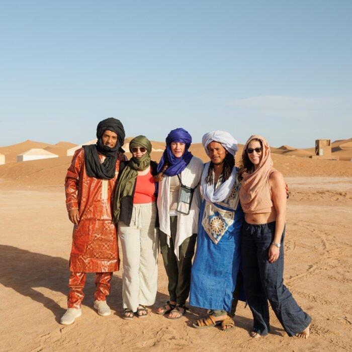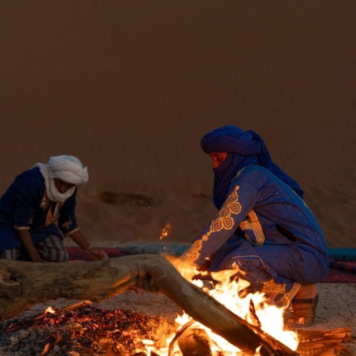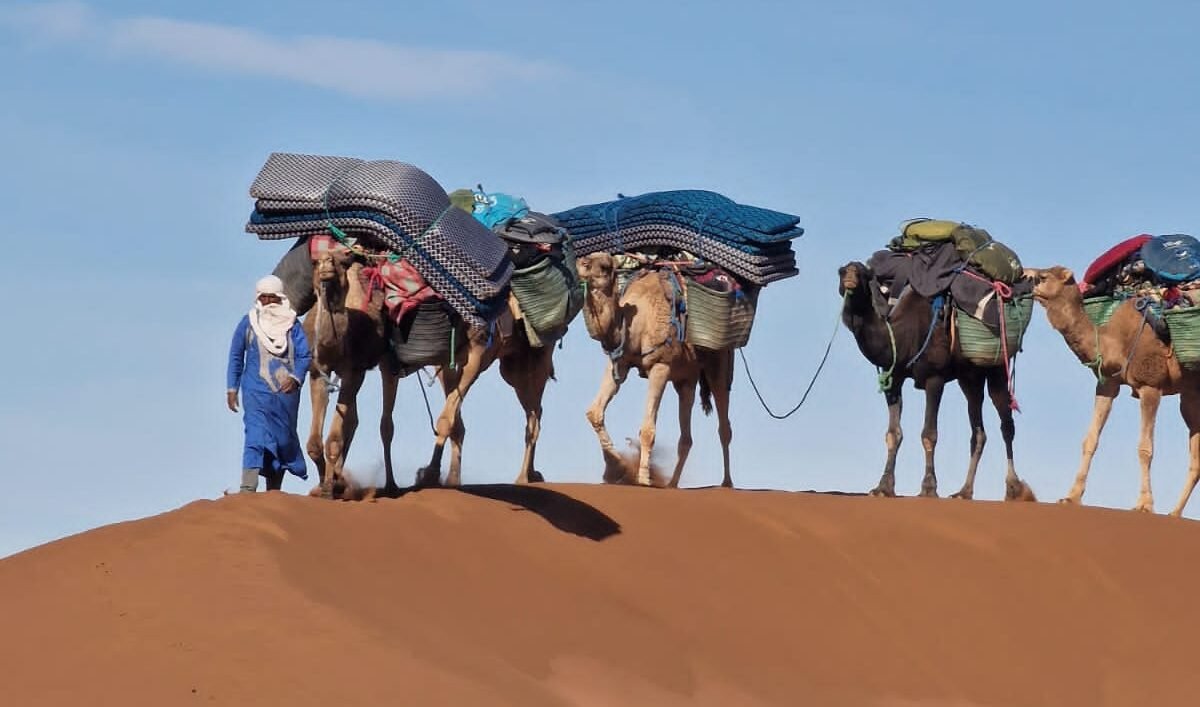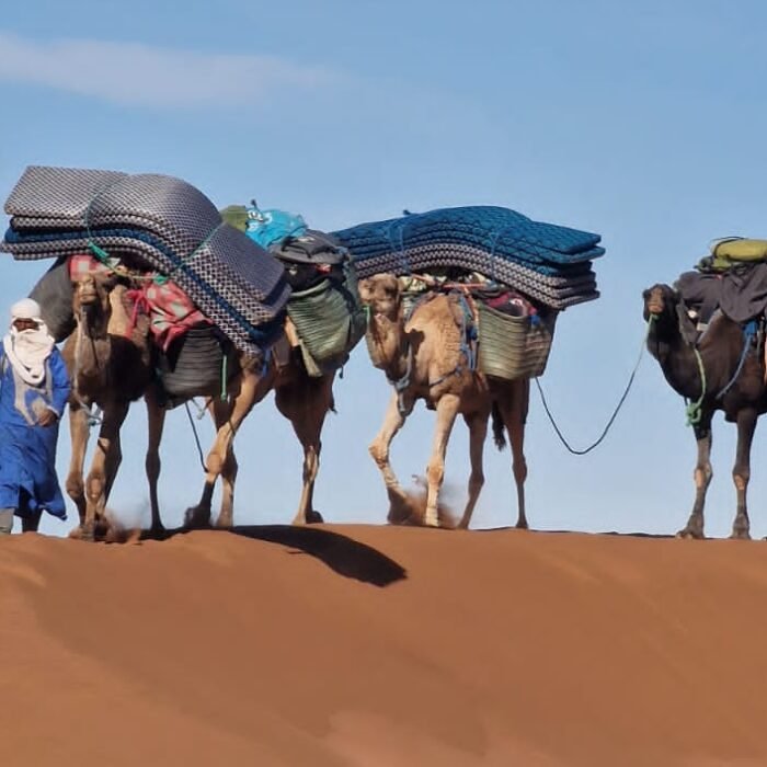 On the final day, camp is raised and the caravan walks from Bertham to Mzouaria, stopping for lunch. After a brief rest, the trek concludes with a return to the fixed bivouac at M’hamid, where the journey ends with a well-deserved evening of rest.