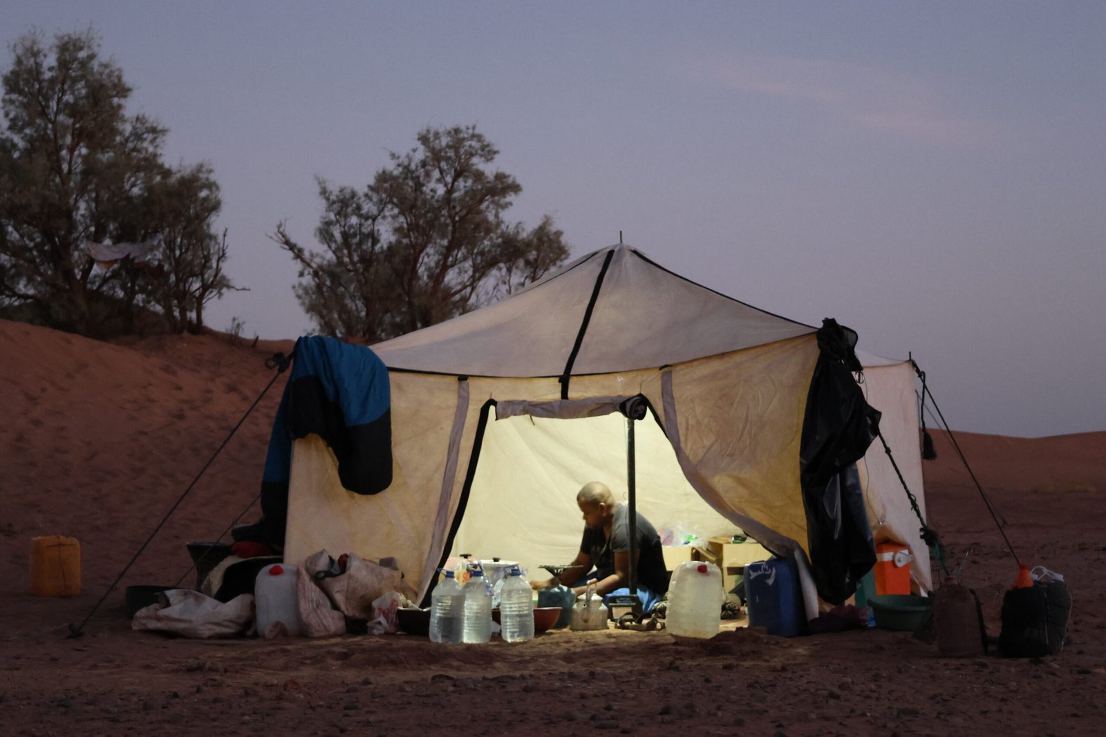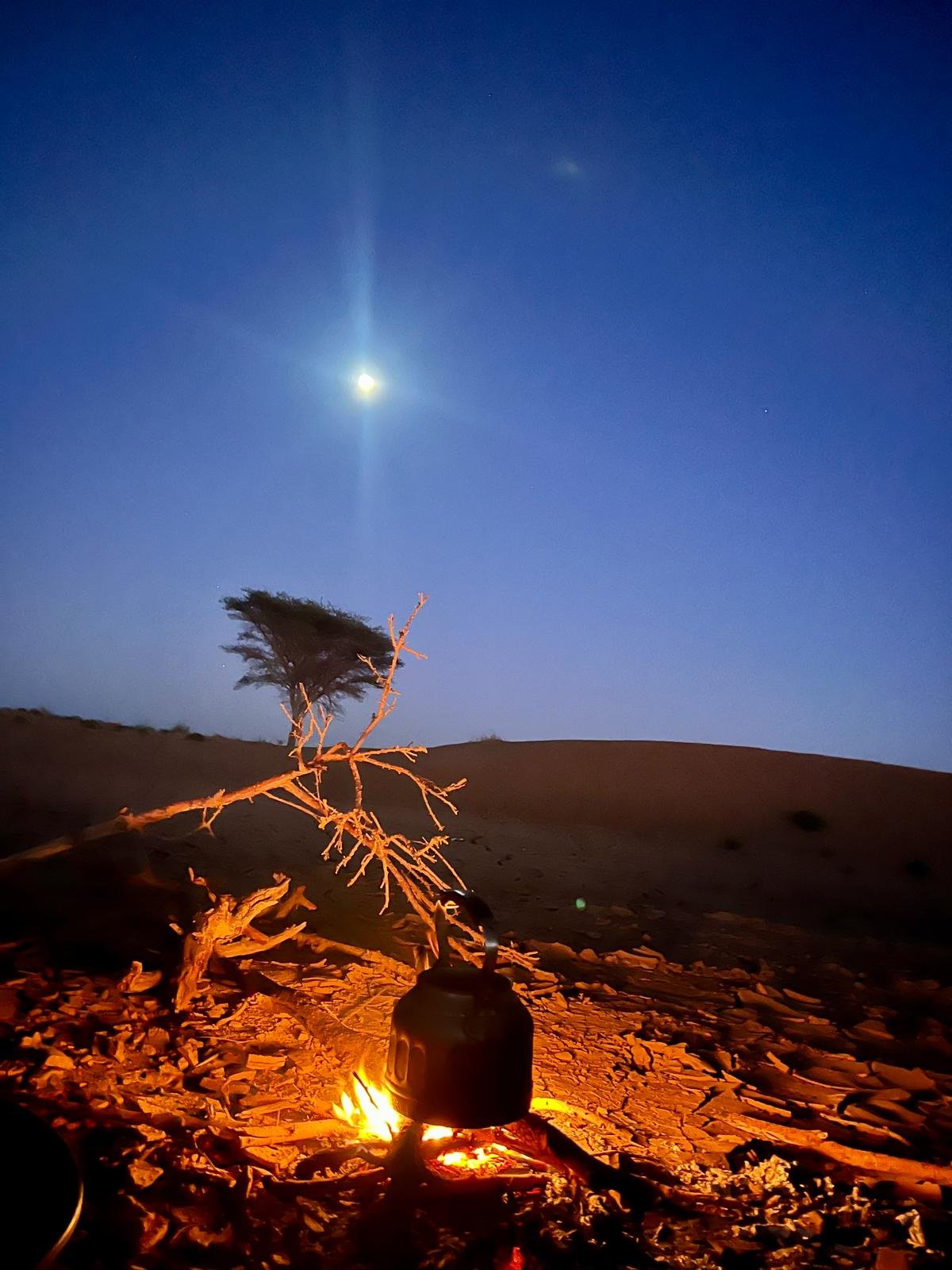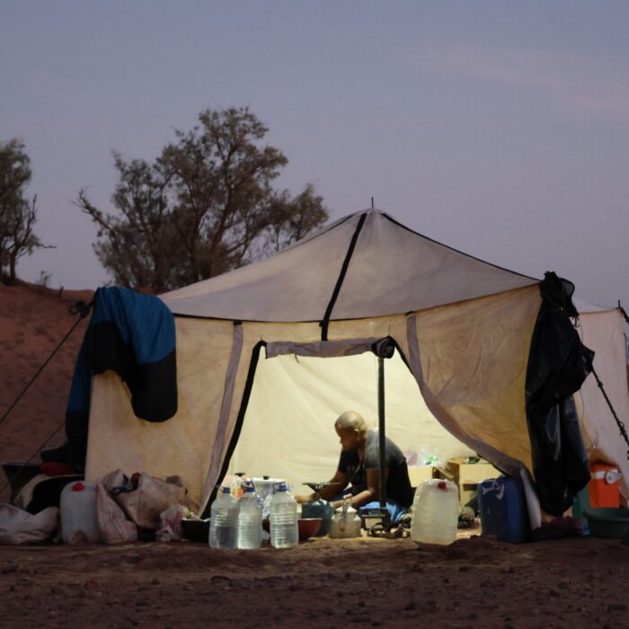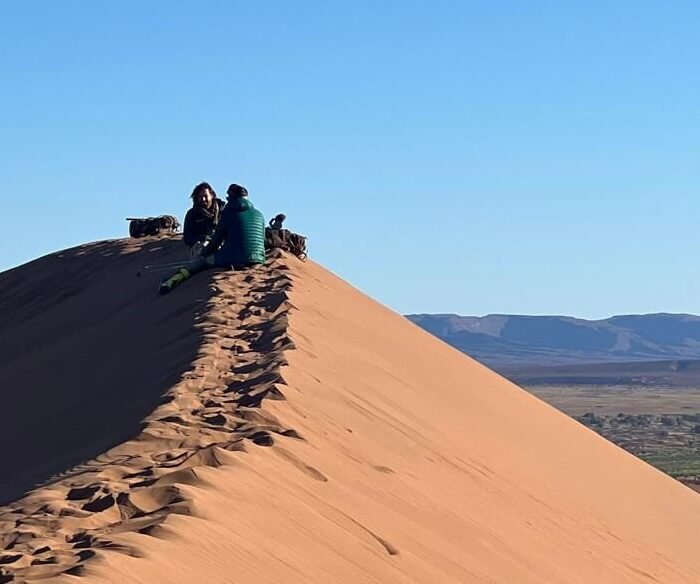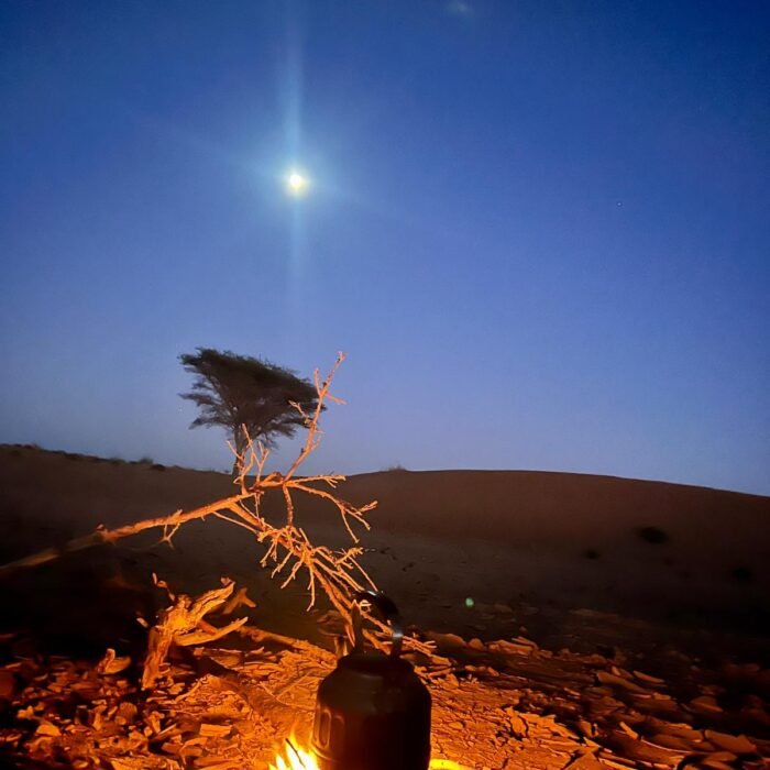 The adventure begins in the afternoon with a 4×4 departure from M’hamid around 2:00 p.m. The drive follows desert tracks for about two hours, including a stop at the Sacred Oasis, a peaceful spot shaded by palm trees. By late afternoon, you arrive at the spectacular dunes of Erg Chegaga, the largest dune field in Morocco. A short 30-minute walk takes you to the top of the highest dune, where you can admire the magical sunset over the endless desert. Afterward, return to camp for mint tea, traditional songs with darbouka drums, dinner, and an overnight stay in a nomad tent at Chegaga Star Camp Lodge.