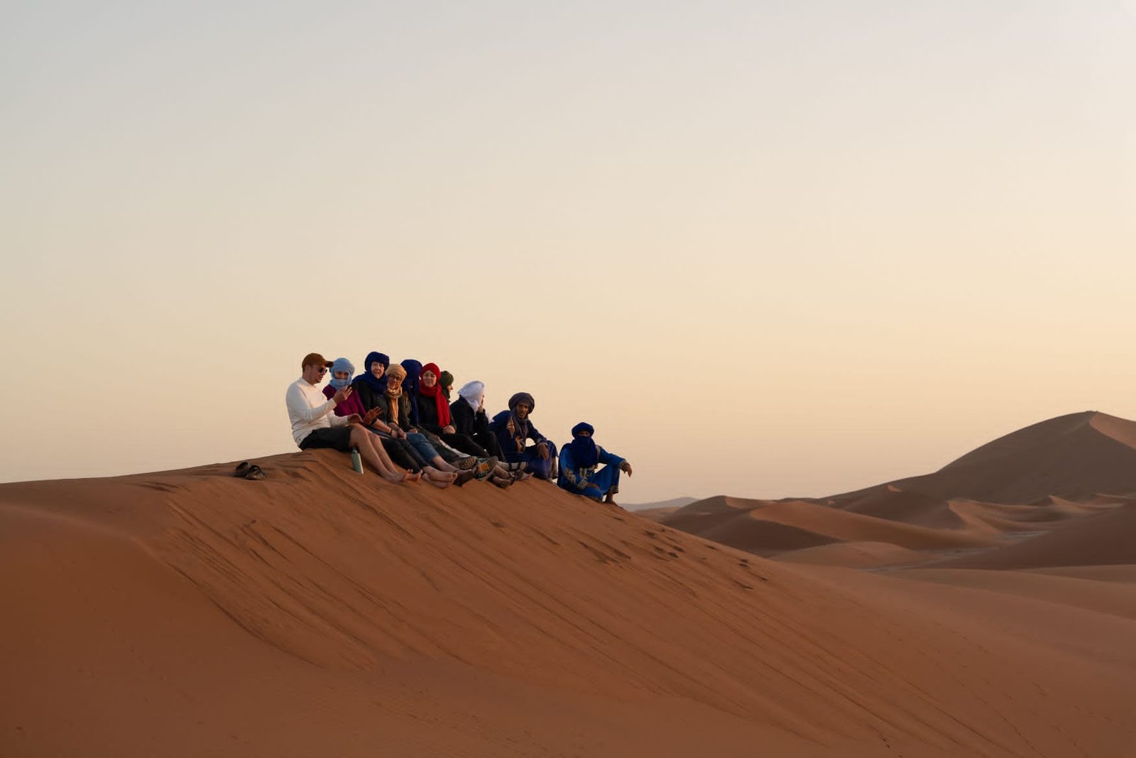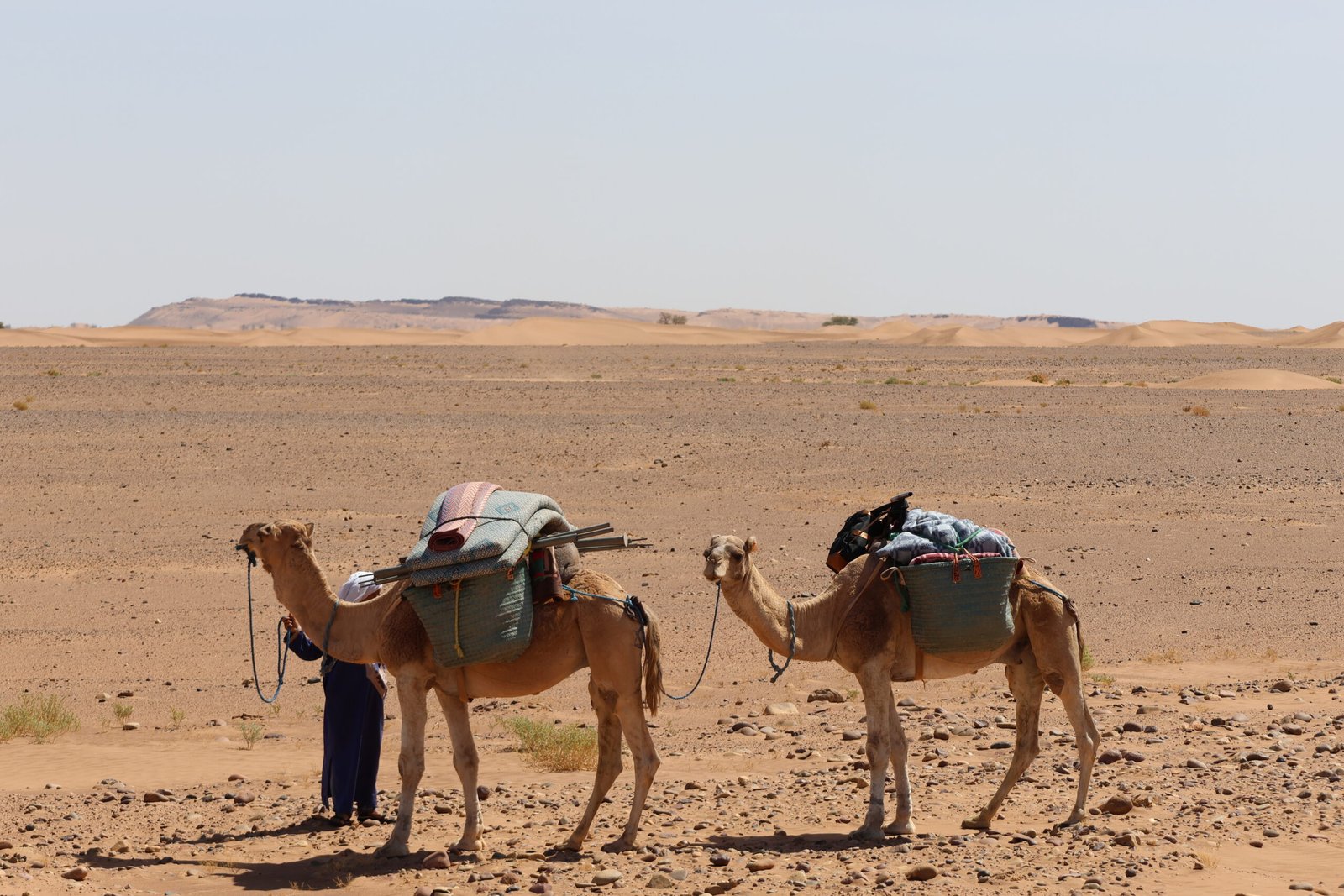 On the final day, after breakfast and breaking camp, the camels are loaded for a gentle three-hour walk back to M’hamid. Lunch is served at the fixed bivouac, followed by free time to settle into tents, stroll through the village, or relax in a traditional steam bath. The adventure concludes with a festive evening at the M’hamid bivouac, sharing a final meal and stories of the journey.