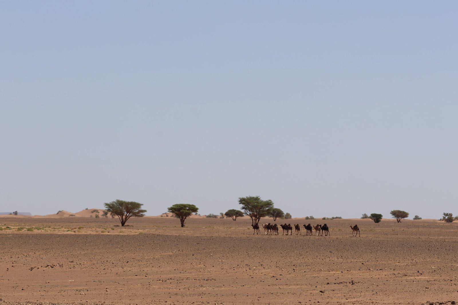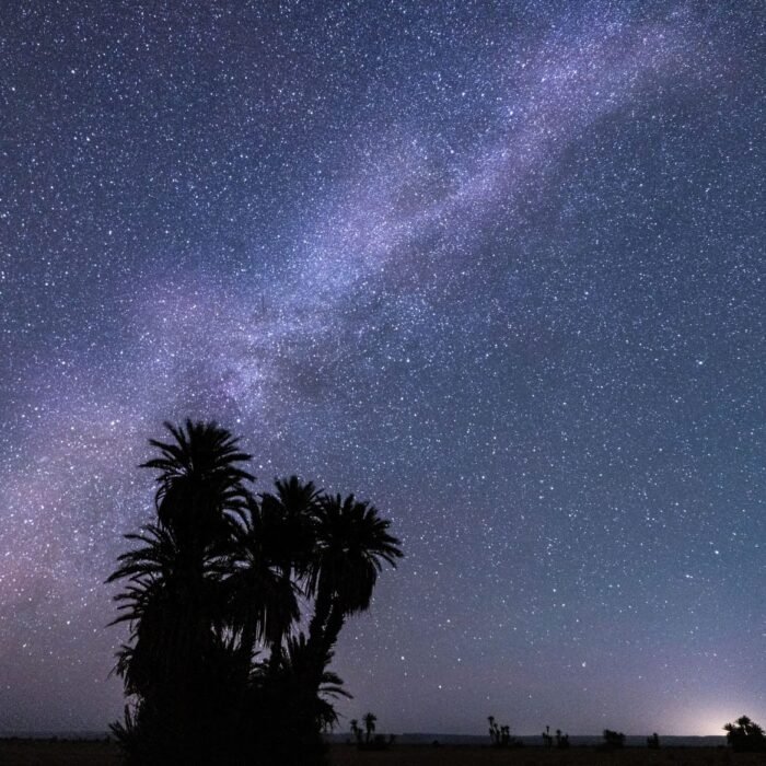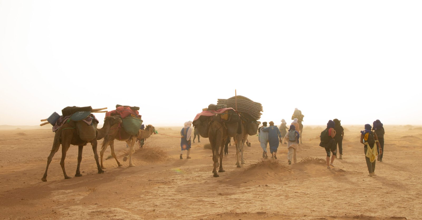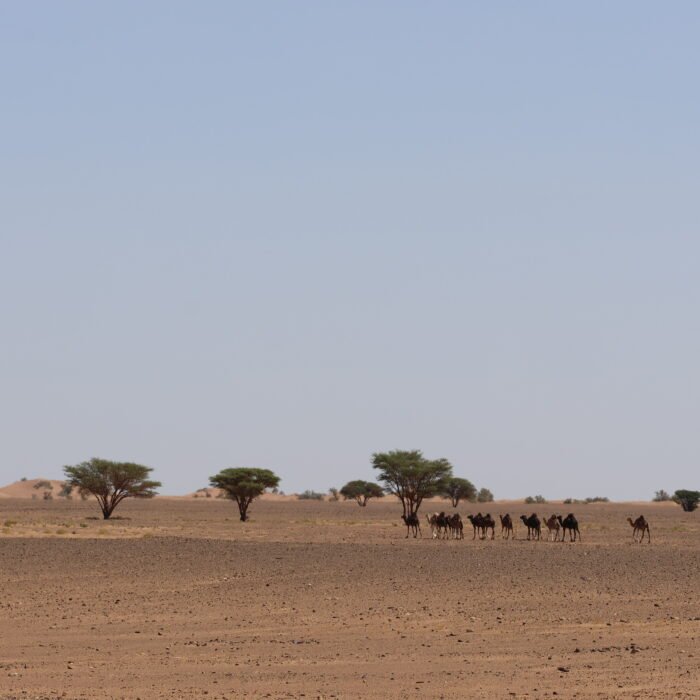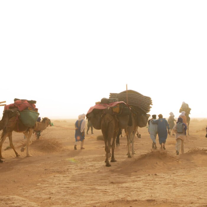 Finally, on the ninth day, after an early breakfast, camp is broken, and camels are loaded for a gentle three-hour walk back to M’hamid. Upon arrival, lunch is served at the fixed bivouac, followed by free time in the afternoon to stroll through the village or relax in a traditional steam bath. The adventure concludes with a farewell dinner and a convivial final evening at the M’hamid bivouac.